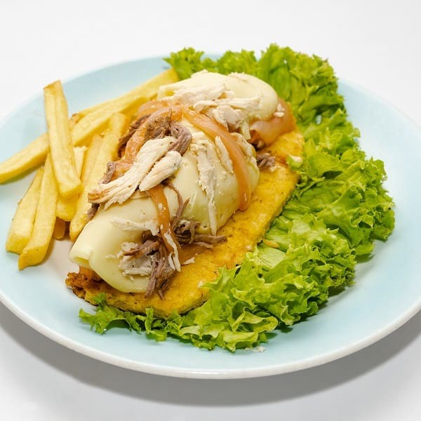 Pollo desmechado, carne desmechado, cebolla grille, jamón, queso fundido, salsas.