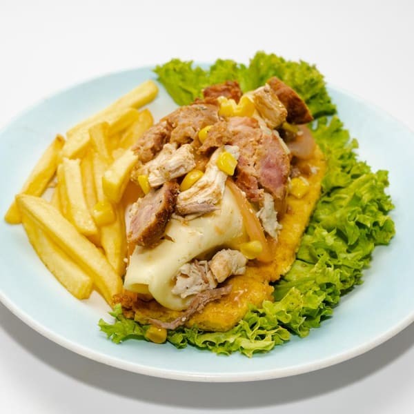 Salchicha ranchera, carne desmechada, maíz tierno, chorizo paisa, cebolla grille, jamón, queso fundido, salsas.